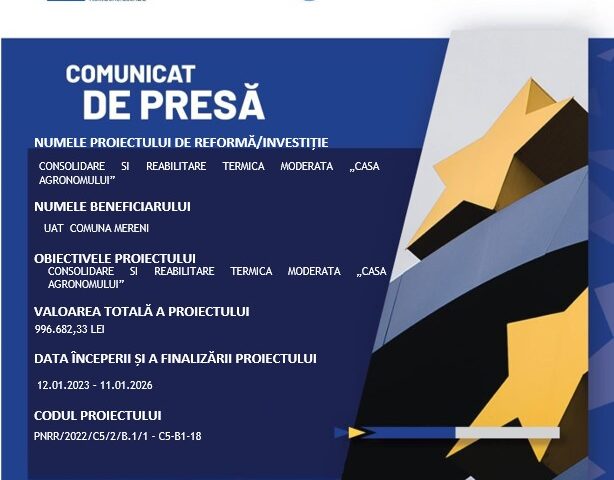 Unitatea Administrativ Teritoriala, Comuna MERENI, judet Constanta in calitate de Beneficiar implementează proiectul cu titlul CONSOLIDARE SI REABILITARE TERMICA MODERATA “CASA AGRONOMULUI”, finantat din PLANUL NAȚIONAL DE REDRESARE ȘI REZILIENȚĂ, Componenta 5 — Valul renovării, Axa 2 — Schema de granturi pentru eficiență energetică și reziliență în clădiri publice, Operațiunea B.1: Renovarea integrată (consolidare seismică și renovare energetică moderată) a clădirilor publice, Apel de proiecte: PNRR/2022/C5/2/B.1/1, în baza contractului de finantare nerambursabila nr. 145130/21.12.2022, încheiat cu Ministerul Dezvoltarii, Lucrarilor Publice si Administratiei.